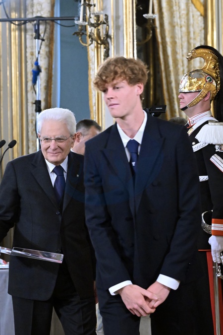 Italian President Sergio Mattarella meets the Italian tennis team, winners of the 2023 Davis Cup, at the Palazzo del Quirinale in Rome, Italy, February 1, 2024. Pictured with Jannik Sinner, Credit:Maria Laura Antonelli / Avalon