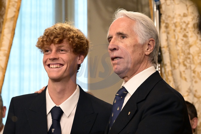 Italian President Sergio Mattarella meets the Italian tennis team, winners of the 2023 Davis Cup, at the Palazzo del Quirinale in Rome, Italy, February 1, 2024. Pictured Jannik Sinner and Giovanni Malago' CONI, Credit:Maria Laura Antonelli / Avalon