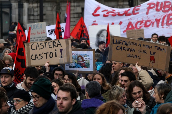 Des enseignants et membres de l'éducation nationale participent à un manifestation organisé par les syndicats de l'enseignement français pour la revalorisation des salaires et des conditions de travaii, à Paris, France, le 1er février 2024. Un manifestant porte une pancarte sur laquelle est inscrit : " Castéra, Cassse toi " © Stéphane Lemouton/Bestimage People participated in a rally organized by French teaching unions over pay and conditions in Paris, France, on February 1, 2024.