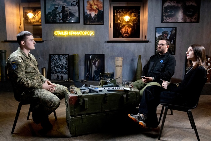 KYIV, UKRAINE - JANUARY 29, 2024 - Head of the press service of the Eastern Group of the Armed Forces of Ukraine Illia Yevlash, hosts Kostiantyn and Vlada Liberov (L to R) are seen during the recording of the program "Kramatorsk Station", a joint project between Ukrinform and the Center for Countering Disinformation, Kyiv, capital of Ukraine., Credit:Pavlo_Bagmut / Avalon