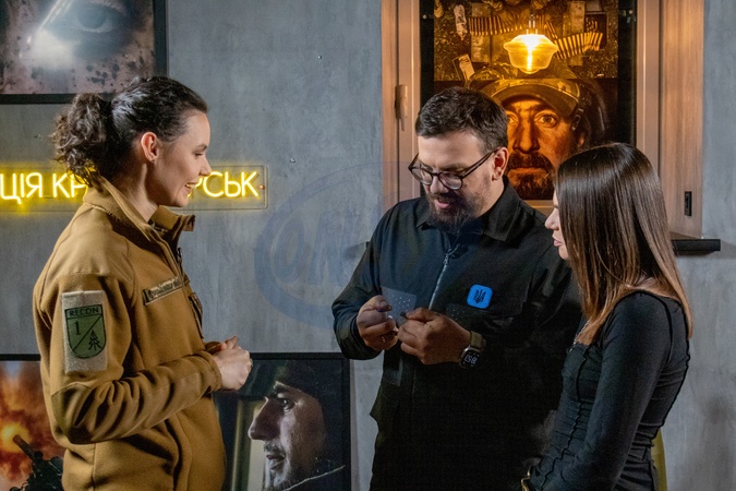 KYIV, UKRAINE - JANUARY 29, 2024 - A servicewoman of the National Guard of Ukraine Khrystyna, call sign "Kudriava", hosts Kostiantyn and Vlada Liberov (L to R) are seen after the recording of the program "Kramatorsk Station", a joint project between Ukrinform and the Center for Countering Disinformation, Kyiv, capital of Ukraine., Credit:Pavlo_Bagmut / Avalon
