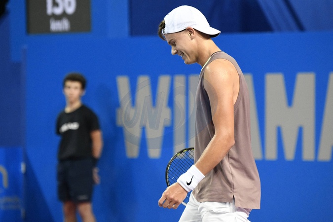 MONTPELLIER, FRANCE - FEBRUARY 1 : Holger RUNE (DEN) smiles during the 2nd round of the ATP 250 Open Sud de France tournament vs. Pablo LLAMAS RUIZ (ESP) in Montpellier, France on February 1st, 2024.