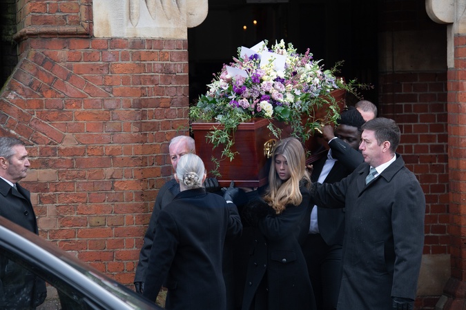 Daughter Darcey Draper acts as a pallbearer carrying her father Derek Draper's coffin at his funeral service at Church of St Mary The Virgin, Primrose Hill, London, England, UK on Friday 2 February, 2024., Credit:Justin Ng / Avalon