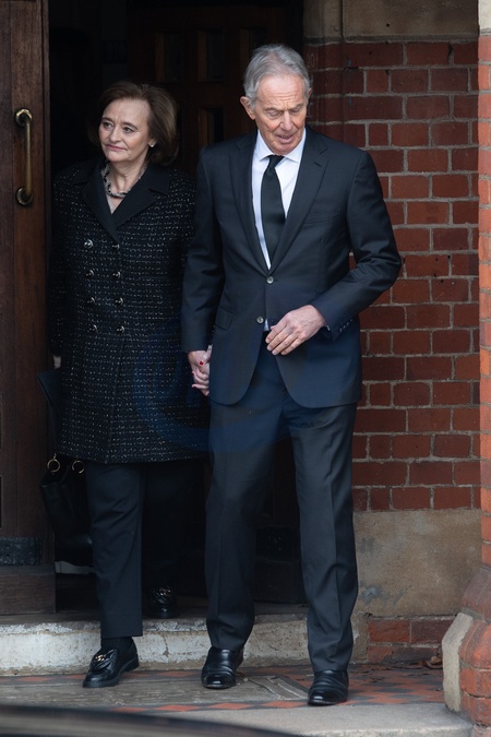 Former Prime Minister Tony Blair and wife Cherie Blair at Derek Draper's funeral service at Church of St Mary The Virgin, Primrose Hill, London, England, UK on Friday 2 February, 2024., Credit:Justin Ng / Avalon