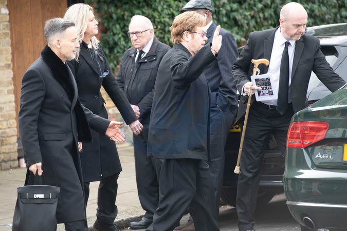 Sir Elton John and husband David Furnish at Derek Draper's funeral service at Church of St Mary The Virgin, Primrose Hill, London, England, UK on Friday 2 February, 2024., Credit:Justin Ng / Avalon