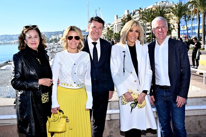 Anne Barrère, Vice-présidente de la Fondation Hôpitaux de Paris-Hôpitaux de France, Laura Tenoudji Estrosi, son mari Christian Estrosi, le maire de Nice, la Première dame française, Brigitte Macron (présidente de la Fondation Hôpitaux de Paris-Hôpitaux de France), et le sélectionneur de l'équipe de France de football, Didier Deschamps (parrain de l'opération Pièces Jaunes), durant la clôture de l'édition 2024 de la 35eme Opération Pièces Jaunes à Nice, au kiosque à musique du jardin Albert 1er, le 2 février 2024. Cette collecte de fonds "Pièces Jaunes" est destinée à améliorer la vie des enfants hospitalisés. © Bruno Bebert/Bestimage Closing of the ‘Pièces Jaunes' event in Nice, France, le 3 février 2024.
