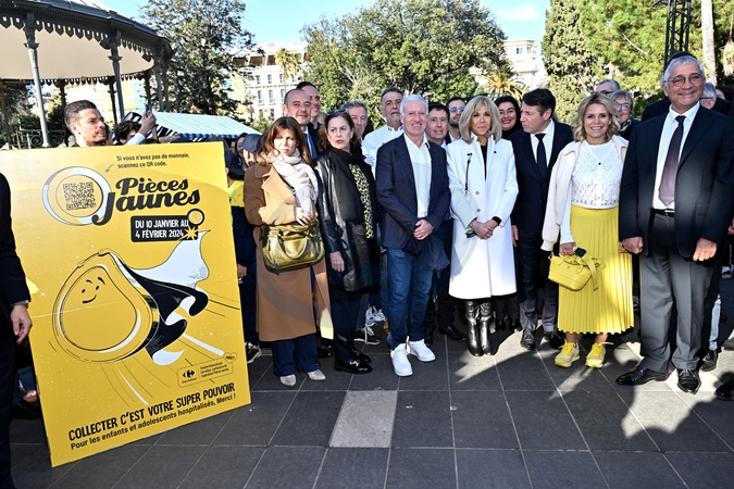 Marion Cinalli, la directrice générale de la Fondation des Hôpitaux, Lionel Servant, le directeur général de l'hôtel Negresco, Anne Barrère, Vice-présidente de la Fondation Hôpitaux de Paris-Hôpitaux de France, le sélectionneur de l'équipe de France de football, Didier Deschamps (parrain de l'opération Pièces Jaunes), le docteur Hervé Cael, conseiller municipal de Nice et vice-président du conseil de surveillance du CHU de Nice, la Première dame française, Brigitte Macron (présidente de la Fondation Hôpitaux de Paris-Hôpitaux de France), Christian Estrosi, le maire de Nice, sa femme, Laura Tenoudji Estrosi et Eric Abihssira, le président de la Fédération de l'hôtellerie, de la restauration et du tourisme (FHRT) Nice Côte d'Azur, durant la clôture de l'édition 2024 de la 35eme Opération Pièces Jaunes à Nice, au kiosque à musique du jardin Albert 1er, le 2 février 2024. Cette collecte de fonds "Pièces Jaunes" est destinée à améliorer la vie des enfants hospitalisés. © Bruno Bebert/Bestimage Closing of the ‘Pièces Jaunes' event in Nice, France, le 3 février 2024.