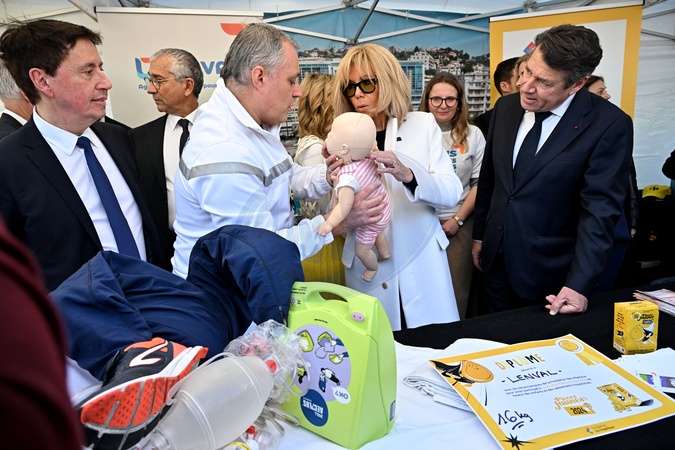 Le docteur Hervé Cael, conseiller municipal de Nice et vice-président du conseil de surveillance du CHU de Nice, la Première dame française, Brigitte Macron (présidente de la Fondation Hôpitaux de Paris-Hôpitaux de France), et Christian Estrosi, le maire de Nice, durant la clôture de l'édition 2024 de la 35eme Opération Pièces Jaunes à Nice, au kiosque à musique du jardin Albert 1er, le 2 février 2024. Cette collecte de fonds "Pièces Jaunes" est destinée à améliorer la vie des enfants hospitalisés. © Bruno Bebert/Bestimage Closing of the ‘Pièces Jaunes' event in Nice, France, le 3 février 2024.