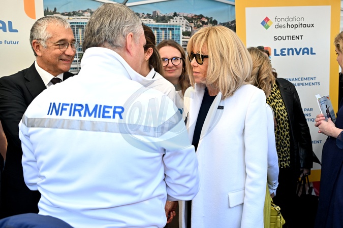 Eric Abihssira, le président de la Fédération de l'hôtellerie, de la restauration et du tourisme (FHRT) Nice Côte d'Azur, et la Première dame française, Brigitte Macron (présidente de la Fondation Hôpitaux de Paris-Hôpitaux de France), durant la clôture de l'édition 2024 de la 35eme Opération Pièces Jaunes à Nice, au kiosque à musique du jardin Albert 1er, le 2 février 2024. Cette collecte de fonds "Pièces Jaunes" est destinée à améliorer la vie des enfants hospitalisés. © Bruno Bebert/Bestimage Closing of the ‘Pièces Jaunes' event in Nice, France, le 3 février 2024.