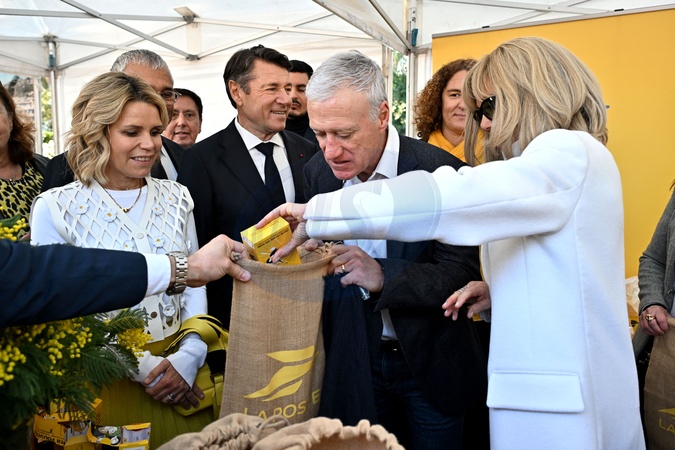 Laura Tenoudji Estrosi, son mari, Christian Estrosi, le maire de Nice, le sélectionneur de l'équipe de France de football, Didier Deschamps (parrain de l'opération Pièces Jaunes), et la Première dame française, Brigitte Macron (présidente de la Fondation Hôpitaux de Paris-Hôpitaux de France), durant la clôture de l'édition 2024 de la 35eme Opération Pièces Jaunes à Nice, au kiosque à musique du jardin Albert 1er, le 2 février 2024. Cette collecte de fonds "Pièces Jaunes" est destinée à améliorer la vie des enfants hospitalisés. © Bruno Bebert/Bestimage Closing of the ‘Pièces Jaunes' event in Nice, France, le 3 février 2024.