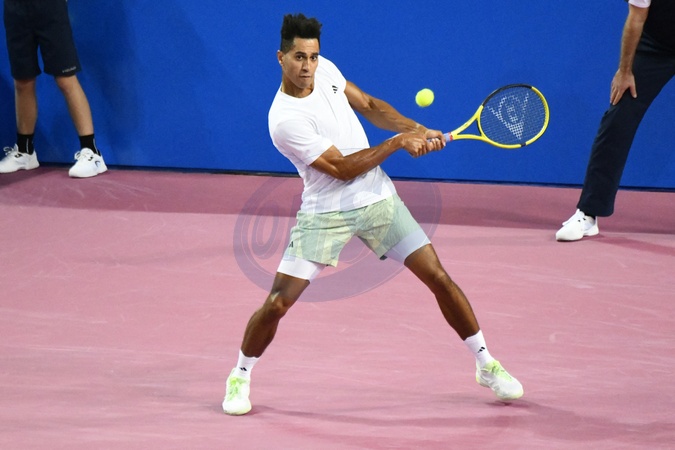 Tournoi de tennis Open Sud de France à Montpellier le 2 février 2024. © Valentina Claret / Panoramic / Bestimage MONTPELLIER, FRANCE - FEBRUARY 2 : Michael MMOH (USA) during the 1/4 final of the ATP 250 Open Sud de France tournament vs. Holger RUNE (DEN) in Montpellier, France on February 2nd, 2024.