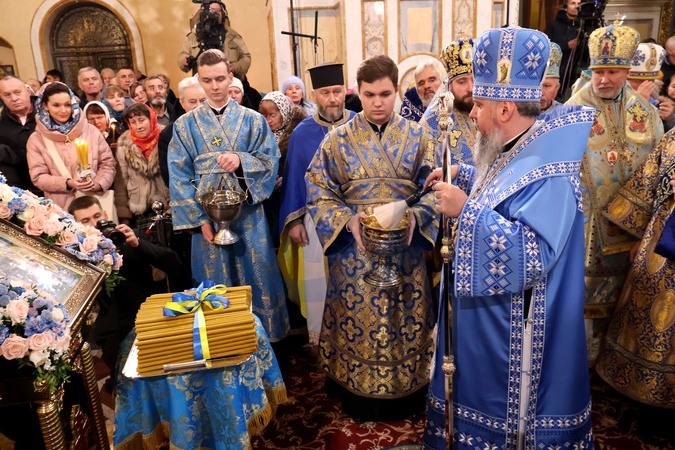 KYIV, UKRAINE - FEBRUARY 2, 2024 - Primate of the Orthodox Church of Ukraine, Metropolitan of Kyiv and All Ukraine His Beatitude Epiphanius (R) blesses the congregation with holy water during a divine liturgy at the Dormition Cathedral of the Kyiv-Pechersk Lavra on Candlemas, Kyiv, capital of Ukraine., Credit:Pavlo_Bagmut / Avalon