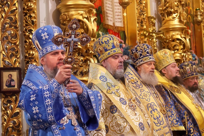 KYIV, UKRAINE - FEBRUARY 2, 2024 - Primate of the Orthodox Church of Ukraine, Metropolitan of Kyiv and All Ukraine His Beatitude Epiphanius (L) holds a crucifix during a divine liturgy at the Dormition Cathedral of the Kyiv-Pechersk Lavra on Candlemas, Kyiv, capital of Ukraine., Credit:Pavlo_Bagmut / Avalon