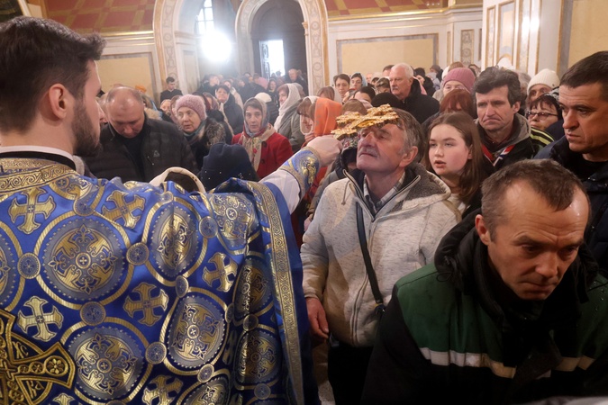 KYIV, UKRAINE - FEBRUARY 2, 2024 - A priest blesses devotees with a crucifix during a divine liturgy at the Dormition Cathedral of the Kyiv-Pechersk Lavra is pictured on Candlemas, Kyiv, capital of Ukraine., Credit:Pavlo_Bagmut / Avalon