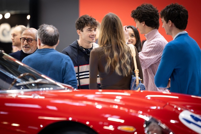 Le pilote Charles Leclerc et sa compagne Alexandra Saint Mleux font un passage au salon Rétromobile 2024 à Paris