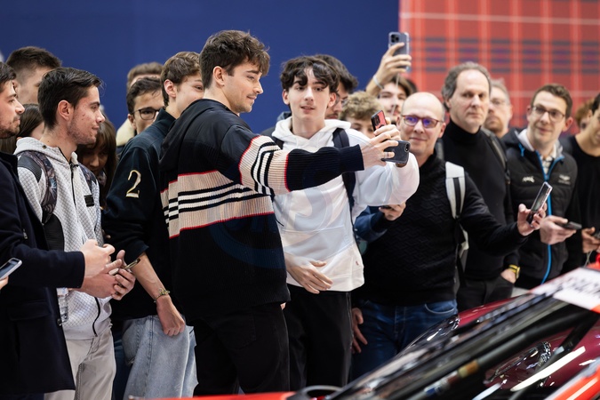 Le pilote Charles Leclerc et sa compagne Alexandra Saint Mleux font un passage au salon Rétromobile 2024 à Paris le 3 février 2024. © Dppi / Panoramic / Bestimage Charles Leclerc, during the Retromobile motorshow 2024 at the Paris Expo Porte de Versailles, from January 30 to February 4, 2024 in Paris, France -