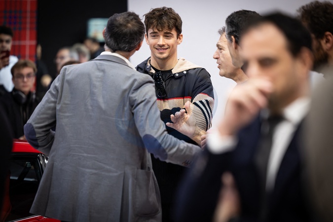 Le pilote Charles Leclerc et sa compagne Alexandra Saint Mleux font un passage au salon Rétromobile 2024 à Paris le 3 février 2024. © Dppi / Panoramic / Bestimage Charles Leclerc, during the Retromobile motorshow 2024 at the Paris Expo Porte de Versailles, from January 30 to February 4, 2024 in Paris, France -