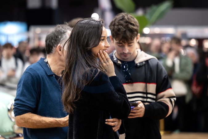 Le pilote Charles Leclerc et sa compagne Alexandra Saint Mleux font un passage au salon Rétromobile 2024 à Paris