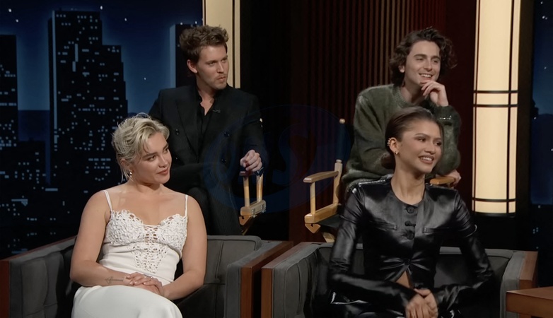 Pictures MUST credit: ABC The cast of new sci-fi sequel Dune : Part Two revealed secrets about themselves in a game of true or false. And it was revealed that 28-year-old British actress Florence Pugh's mother got high with rapper Snoop Dog at the Oscars. And that US starlet Zendaya , 27, had to repeat a year in kindergarten because she got behind on reading and writing. Also Elvis movie heartthrob Austin Butler, 32, got talent scouted at a country fair. Finally Wonka actor Timothee Chalamet , 28, has a rapping alter ego known as Little Timmy True. The game came about on the Jimmy Kimmel US talk show because he wanted to know how much the cast had learned about each other shooting the Dune film, set on a futuristic sand-covered planet. Kimmel explained:” You guys spend a lot of time together I thought maybe we'd play this game.” He handed out paddles with the word "true” on one side and "false” on the other, along with a picture of the jaws of a giant sand worm which appears in the film. Picture supplied by JLPPA