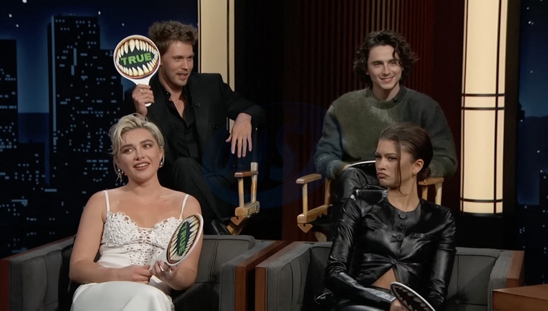 Pictures MUST credit: ABC The cast of new sci-fi sequel Dune : Part Two revealed secrets about themselves in a game of true or false. And it was revealed that 28-year-old British actress Florence Pugh's mother got high with rapper Snoop Dog at the Oscars. And that US starlet Zendaya , 27, had to repeat a year in kindergarten because she got behind on reading and writing. Also Elvis movie heartthrob Austin Butler, 32, got talent scouted at a country fair. Finally Wonka actor Timothee Chalamet , 28, has a rapping alter ego known as Little Timmy True. The game came about on the Jimmy Kimmel US talk show because he wanted to know how much the cast had learned about each other shooting the Dune film, set on a futuristic sand-covered planet. Kimmel explained:” You guys spend a lot of time together I thought maybe we'd play this game.” He handed out paddles with the word "true” on one side and "false” on the other, along with a picture of the jaws of a giant sand worm which appears in the film. Picture supplied by JLPPA