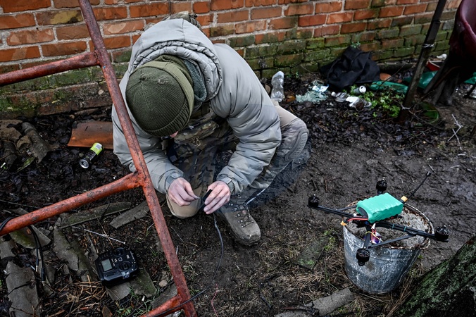 ZAPORIZHZHIA REGION, UKRAINE - JANUARY 27, 2024 - A member of a police unit of FPV pilots fixes a drone in Zaporizhzhia region, southeastern Ukraine., Credit:Dmytro Smolienko / Avalon
