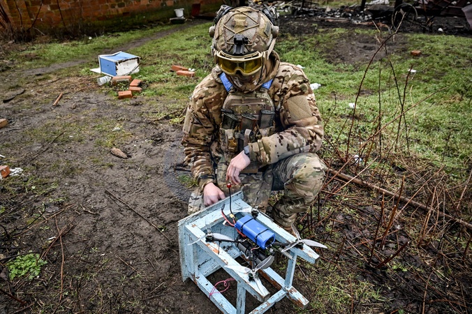 ZAPORIZHZHIA REGION, UKRAINE - JANUARY 27, 2024 - A member of a police unit of FPV pilots kneels by a stool with a drone, Zaporizhzhia region, southeastern Ukraine., Credit:Dmytro Smolienko / Avalon