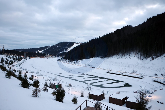 POLIANYTSIA, UKRAINE - FEBRUARY 2, 2024 - The Lake of Youth is situated at the Bukovel ski resort, Polianytsia village, Nadvirna district, Ivano-Frankivsk region, western Ukraine., Credit:Yurii Rylchuk / Avalon