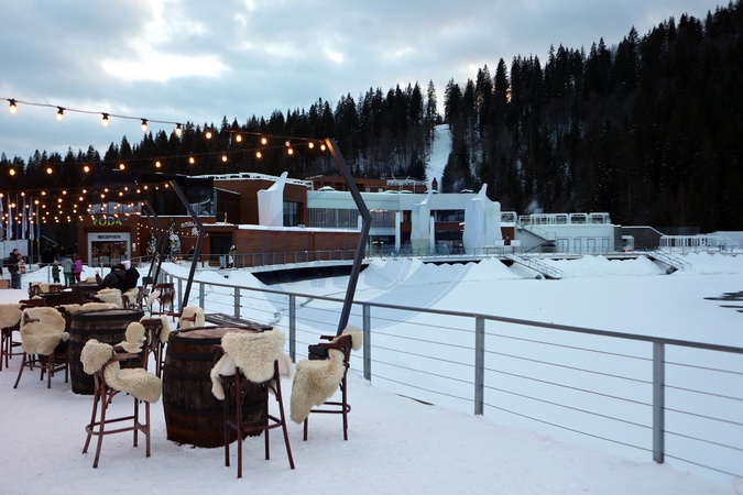 POLIANYTSIA, UKRAINE - FEBRUARY 2, 2024 - An outdoor cafe is seen by the snow-drifted Lake of Youth at the Bukovel ski resort, Polianytsia village, Nadvirna district, Ivano-Frankivsk region, western Ukraine., Credit:Yurii Rylchuk / Avalon