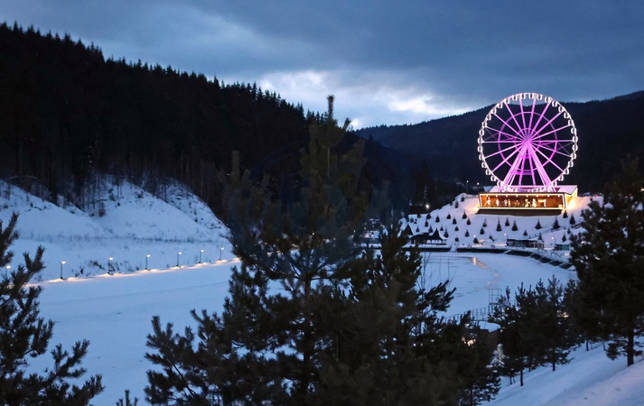 POLIANYTSIA, UKRAINE - FEBRUARY 2, 2024 - The Ferris wheel is situated by the Lake of Youth at the Bukovel ski resort, Polianytsia village, Nadvirna district, Ivano-Frankivsk region, western Ukraine., Credit:Yurii Rylchuk / Avalon