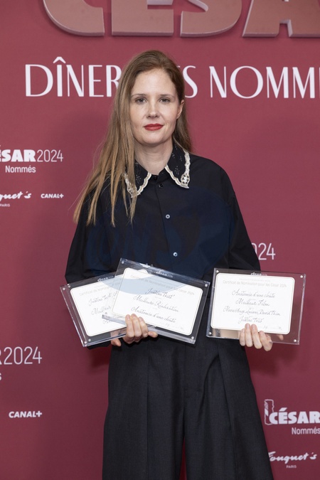 Justine Triet au Photocall des participants au dîner des nommés des César 2024 au Fouquet's Paris le 5 février 2024. © Olivier Borde / Bestimage Photocall of participants at the César 2024 nominees' dinner at Fouquet's Paris on 5 February 2024
