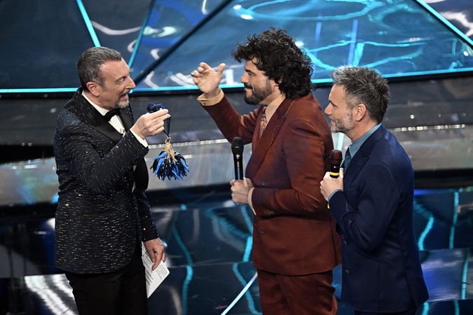 Renga and Nek with Amadeus during Sanremo Italian Song Festival. Sanremo, Italy, 06 February 2024., Credit:Maria Laura Antonelli / Avalon
