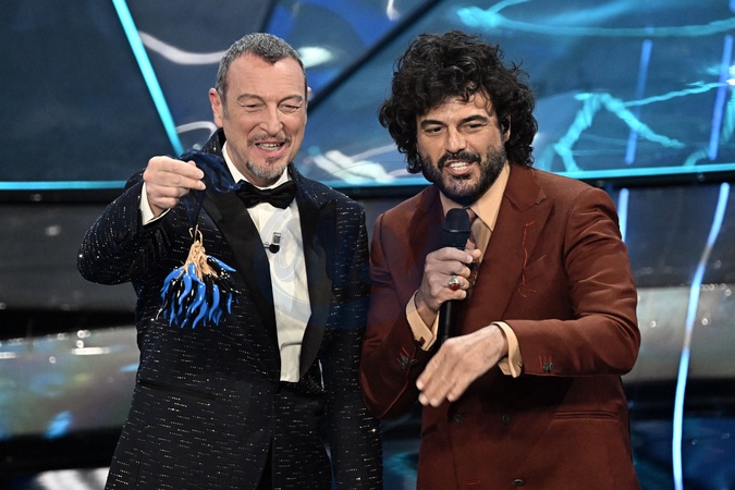 Renga with Amadeus during Sanremo Italian Song Festival. Sanremo, Italy, 06 February 2024., Credit:Maria Laura Antonelli / Avalon
