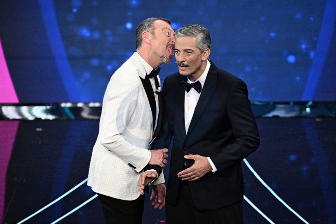 Amadeus and Fiorello during Sanremo Italian Song Festival. Sanremo, Italy, 06 February 2024., Credit:Maria Laura Antonelli / Avalon