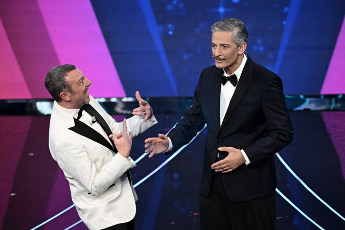 Amadeus and Fiorello during Sanremo Italian Song Festival. Sanremo, Italy, 06 February 2024., Credit:Maria Laura Antonelli / Avalon