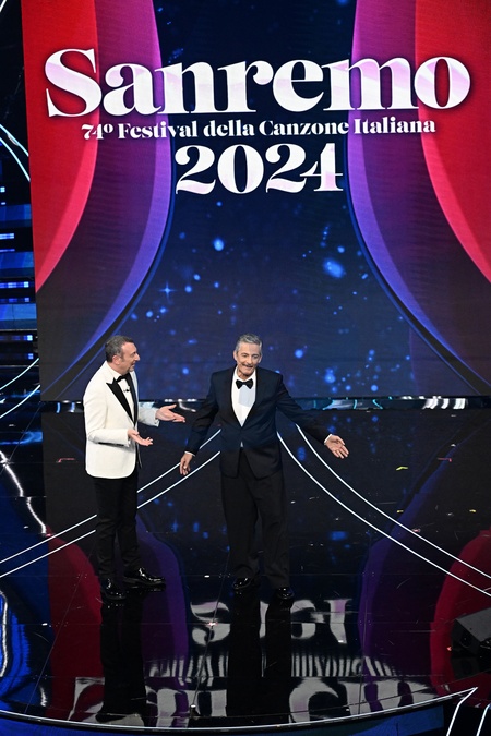 Amadeus and Fiorello during Sanremo Italian Song Festival. Sanremo, Italy, 06 February 2024., Credit:Maria Laura Antonelli / Avalon