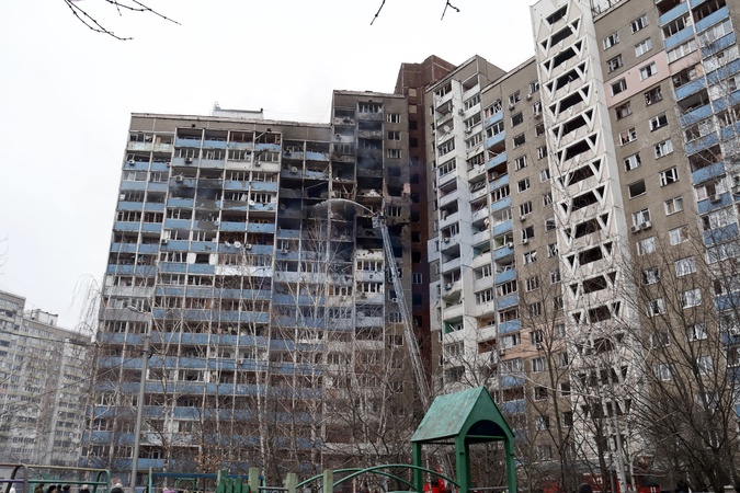 KYIV, UKRAINE - FEBRUARY 7, 2024 - Firefighters put out a fire in a block of flats in the Holosiivskyi district hit by falling Russian missile debris after the Russian attack on Ukraine on Wednesday morning, February 7, Kyiv, capital of Ukraine., Credit:Eugen Kotenko / Avalon