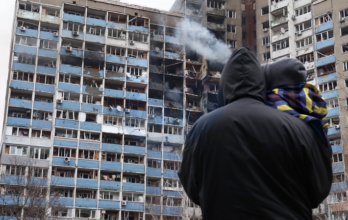 KYIV, UKRAINE - FEBRUARY 7, 2024 - A man holding a baby faces a block of flats in the Holosiivskyi district hit by falling Russian missile debris during the Russian attack on Ukraine on Wednesday morning, February 7, Kyiv, capital of Ukraine., Credit:Eugen Kotenko / Avalon