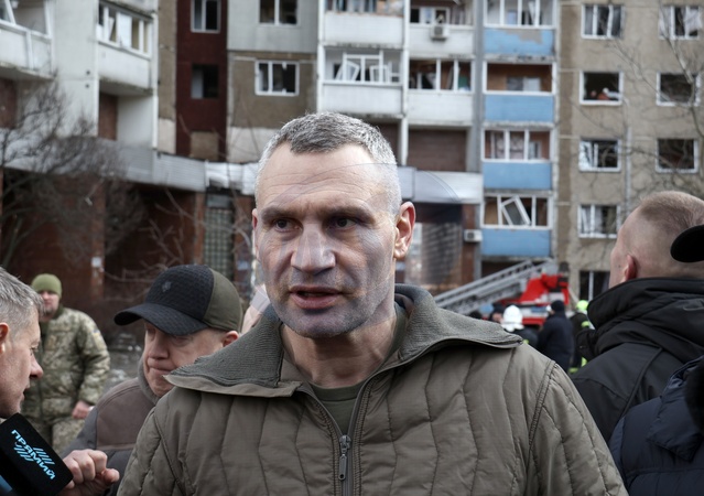 KYIV, UKRAINE - FEBRUARY 7, 2024 - Kyiv city head Vitali Klitschko speaks to the press outside a block of flats in the Holosiivskyi district hit by falling Russian missile debris after the Russian attack on Ukraine on Wednesday morning, February 7, Kyiv, capital of Ukraine., Credit:Eugen Kotenko / Avalon