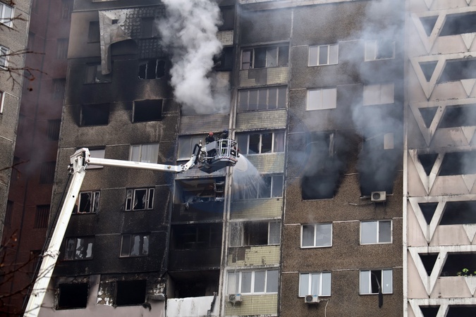 KYIV, UKRAINE - FEBRUARY 7, 2024 - Firefighters put out a fire in a block of flats in the Holosiivskyi district hit by falling Russian missile debris after the Russian attack on Ukraine on Wednesday morning, February 7, Kyiv, capital of Ukraine., Credit:Eugen Kotenko / Avalon