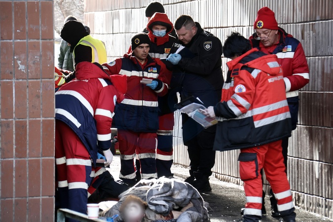 KYIV, UKRAINE - FEBRUARY 7, 2024 - Paramedics examine the body of a resident who died in a block of flats in the Holosiivskyi district hit by falling Russian missile debris as seen after the Russian attack on Ukraine on Wednesday morning, February 7, Kyiv, capital of Ukraine., Credit:Eugen Kotenko / Avalon
