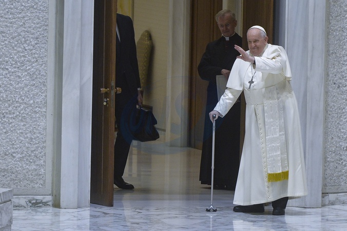 Italy, Rome, February 7, 2024 : Pope Francis walks with the help of a stick, during the weekly general audience in Paolo VI room, Credit:Stefano Carofei / Avalon