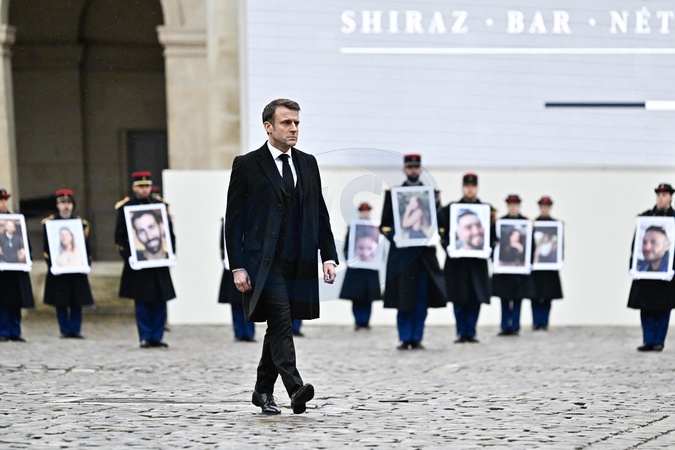 Le président de la République française Emmanuel Macron passe devant les membres de la garde républicaine française qui tiennent les portraits des 42 victimes françaises des attaques terroristes du 7 octobre en Israël - Cérémonie d'hommage national aux victimes françaises des attaques terroristes du 7 octobre en Israël dans la cour d'honneur de l'Hôtel national des Invalides, à Paris, France, le 7 février 2024. Quatre mois jour pour jour après les attentats terroristes qui ont frappé Israël et le peuple israélien et qui ont causé la mort de 42 de nos concitoyens. A ce jour, trois de nos compatriotes demeurent toujours disparus et présumés otages, et la France n'a de cesse d'œuvrer avec ses partenaires pour leur libération. ©Eric Tschaen/Pool/Bestimage Ceremony of national homage to the French victims of the terrorist attacks in Israel on 7 October in the Cour d'Honneur of the Hôtel National des Invalides on 7 February 2024. Four months to the day after the terrorist attacks that struck Israel and the Israeli people, killing 42 of our fellow citizens. To this day, three of our compatriots remain missing and presumed hostages, and France continues to work with its partners for their release.