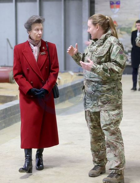 Bicester, UK, 07 February 2024: Britain's Princess Anne, Princess Royal speaks with military personnel as she views a demonstration in the indoor training area during her visit to the Defence Explosive Ordnance Disposal Training Regiment at St George's Barracks in Bicester, UK. The Princess Royal is Colonel in Chief of The Royal Logistical Corps., Credit:Chris Jackson / Avalon