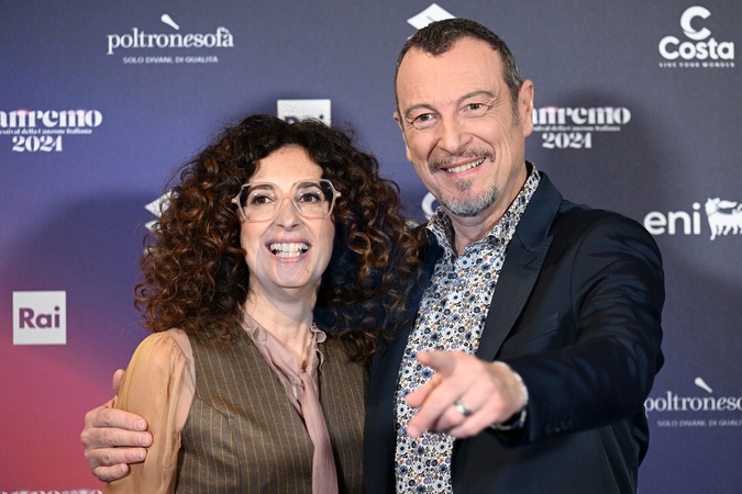 Teresa Mannino and Amadeus, the hosts of the third day of the Sanremo Festival, during the photocall., Credit:Maria Laura Antonelli / Avalon