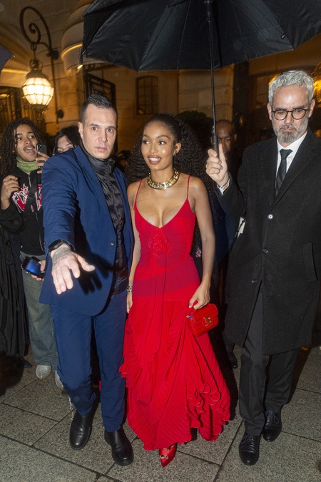 Yara Shahidi à la sortie de l'hôtel Ritz pour se rendre au dîner Cartier à Paris, FGrance, le 7 février 2024. Celebrities at the exit of the Ritz hotel to go to the Cartier dinner in Paris, France, on February 7, 2024.