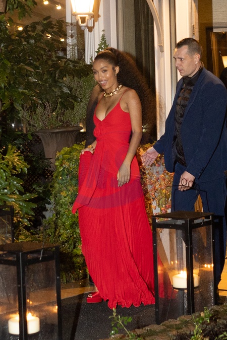 Yara Shahidi à la sortie du dîner Cartier, pour marquer le 100ème anniversaire de sa conception Trinity, chez Alléno Paris - Yannick Alléno au Pavillon Ledoyen à Paris, France, le 7 février 2024. Guests at the Cartier dinner at Alléno Paris - Yannick Alléno at the Pavillon Ledoyen in Paris on 7 February 2024. Cartier marks the 100th anniversary of its Trinity design with new editions that put a striking twist on the classic creation.