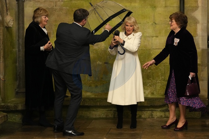 Britain's Queen Camilla hands her umbrella to an aide as he arrives to attend a Musical Evening at Salisbury Cathedral, Salisbury, England, Thursday, Feb. 8, 2024, to celebrate the work of local charities., Credit:Kirsty Wigglesworth / Avalon