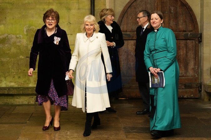 Britain's Queen Camilla arrives and is escorted as she attends a Musical Evening at Salisbury Cathedral, Salisbury, England, Thursday, Feb. 8, 2024, to celebrate the work of local charities., Credit:Kirsty Wigglesworth / Avalon