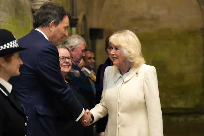 Britain's Queen Camilla shakes hands with John Glen a Member of Parliament as she meets dignitaries while attending a Musical Evening at Salisbury Cathedral, Salisbury, England, Thursday, Feb. 8, 2024, to celebrate the work of local charities., Credit:Kirsty Wigglesworth / Avalon