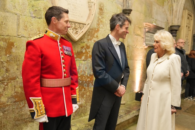 Britain's Queen Camilla speaks to Rupert Egerton-Smith, centre, as she attends a Musical Evening at Salisbury Cathedral, Salisbury, England, Thursday, Feb. 8, 2024, to celebrate the work of local charities. Captain Robert Smith, Director of Music the Grenadier Guards Band, is at right., Credit:Kirsty Wigglesworth / Avalon